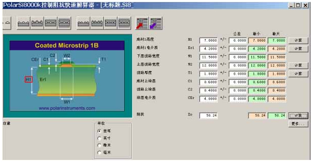 对于有阻抗控制要求的板,目前,PCB工厂比较常见的做法就是在PCB的生产拼版板边适当位置设计一些阻抗试样,这些阻抗试样具有与PCB相同的分层和阻抗线构造。在设计阻抗试样前会预先采用一些阻抗计算软件对阻抗进行模拟计算,以便对阻抗进行预测。其中英国POLAR公司开发的CITS测试系统及计算软件自1991年起已经为许多PCB制造商所使用,而且操作简单、具有强大的功能计算能力。但不管该系统功能有多强大,其计算能力及计算阻抗的场求解工具都依赖于使用“理想的”材质,模拟计算的结果与实际测量的阻抗结果之间总会存在一定的偏差。因此,对于客户阻抗控制精度要求±5%的情况下,采用计算精度比较高的软件进行较为准确的模拟预测就显得尤为重要了。为此,我们采用英国POLAR公司开发的最新计算软件Polar SI8000K 控制阻抗快速解算器进行模拟预测,由于客户要求:为了满足50±5%Ω的阻抗允许PCB厂可对叠层结构做适当调整,而阻抗线宽不可调整,为此,模拟结果如下: