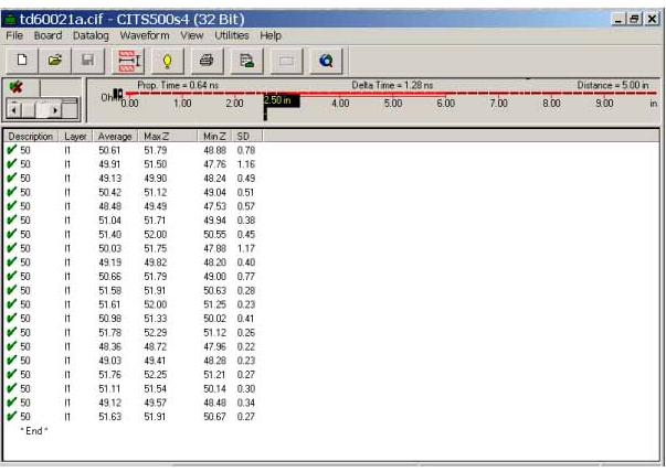 以下是采用TDR测试系统测试该板的阻抗测试结果,从结果可看出该板所测试的阻抗都在47.5∽52.5Ω之间,即完全满足客户50±5%Ω(50±2.5Ω)的阻抗要求. 因此,可看出对于客户±8%甚至±5%的阻抗控制精度要求只要在生产前采用计算精度比较高的软件进行较为准确的模拟预测,结合模拟预测的结果对相应的一些参数做适当调整,在生产过程中对重点工序加以特别的控制,同时,测量时确保测量的正确性,还是可以达到的。